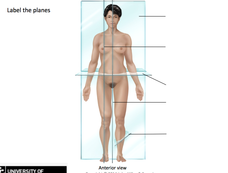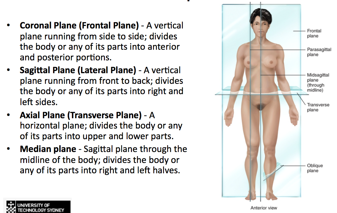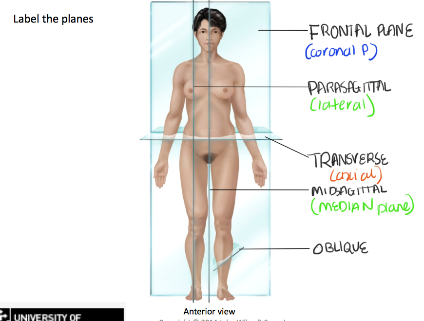 Describe the following anatomical planes: axial/transverse/horizontal, sagiJal and coronal.