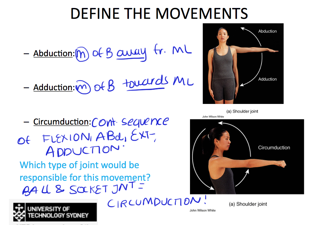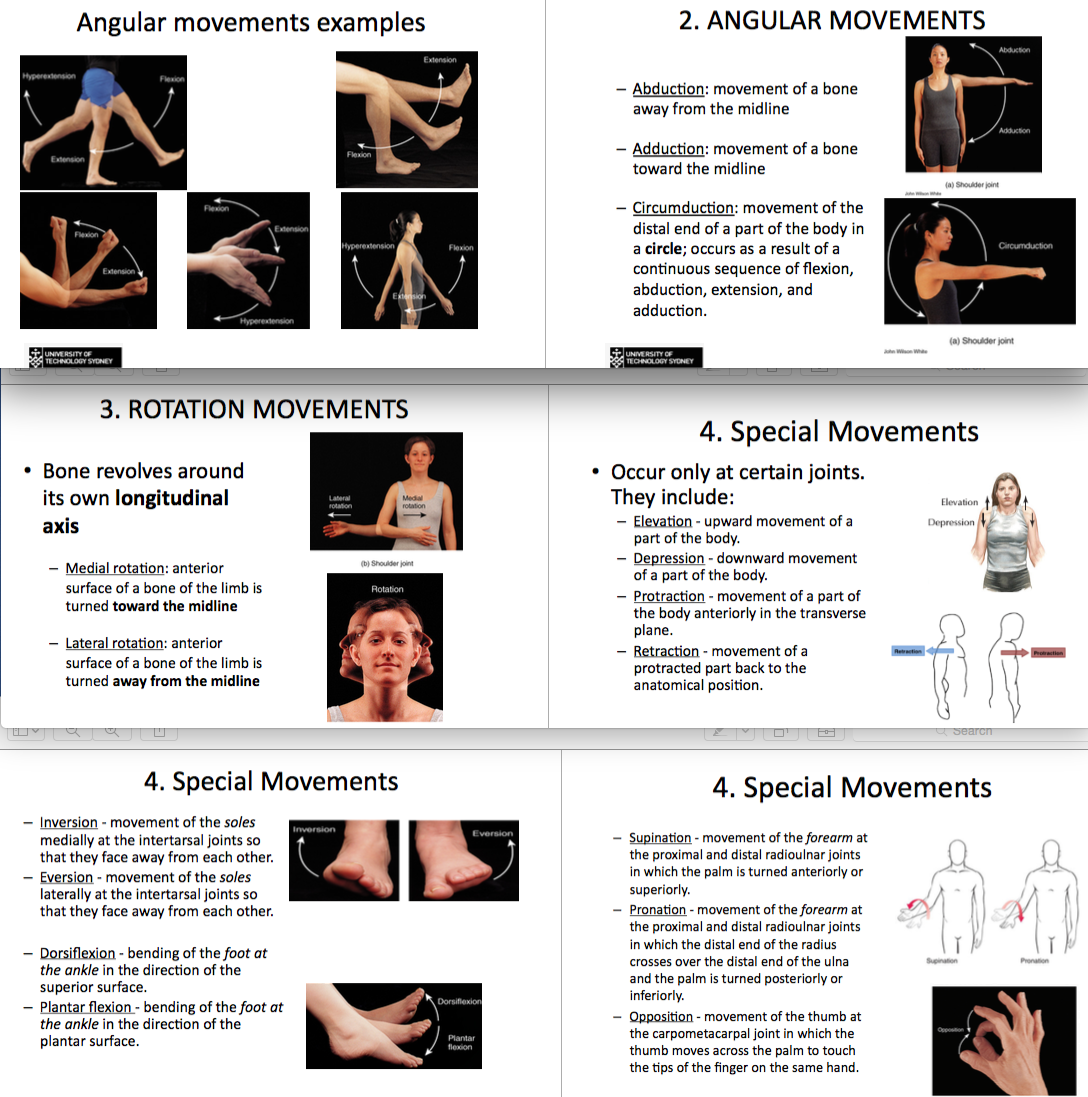 Define flexion, extension, lateral flexion, pronaLon, supinaLon, abducLon, adducLon, medial and lateral rotaLon, inversion, eversion, plantar flexion, dorsiflexion and circumducLon.
