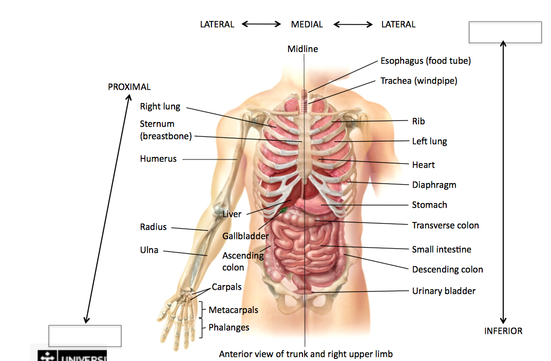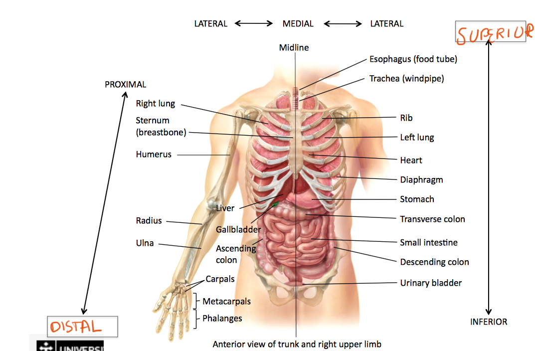 Define medial, lateral, proximal, distal, superior, inferior, deep, superficial,