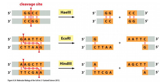 Bacterial Enzymes that cut DNA in specfic sites can produce clean cuts or overhangs