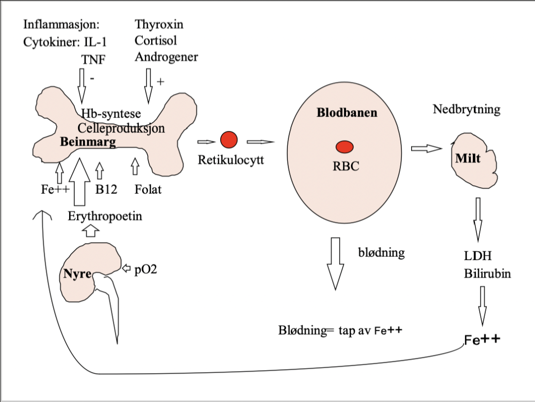 Anemi er redusert B-Hb konsentrasjon; konsekvens er redusert oksygentransport