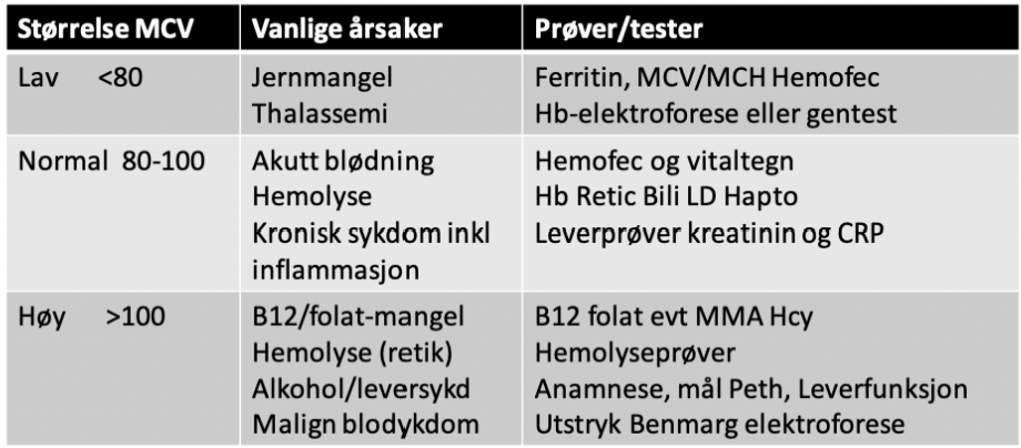 Ved lav MCV kan utredningen med en gang fokuseres på å finne årsaken til blodtap/jernmangel