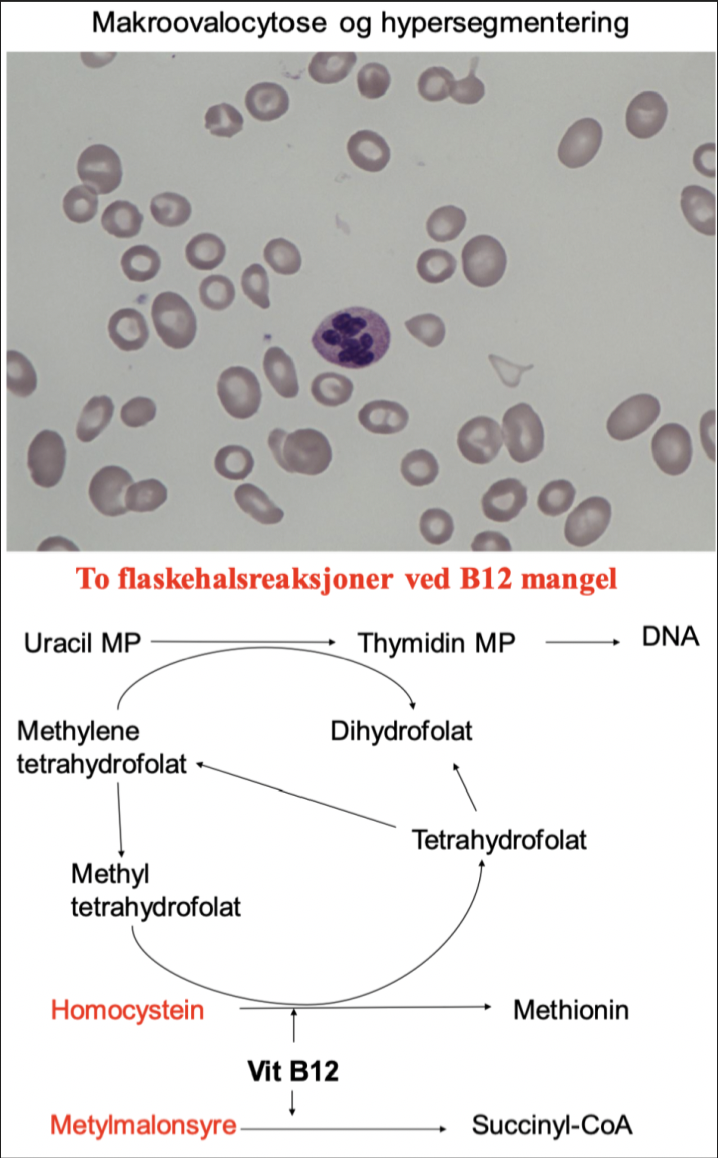 - Makroovalocytose og hypersegmentering i granulocytter i blod (> 5 segmenter)