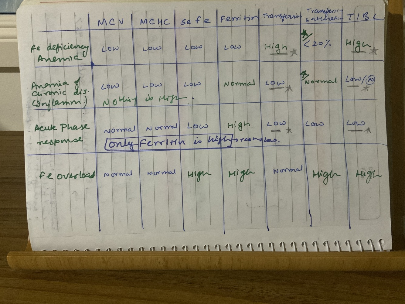 N MCV, N MCHC, ↓ sFe, ↑ ferritin (*note: ferritin is highly variable), ↓ transferrin, ↓ transferrin saturation, ↓ TIBC
