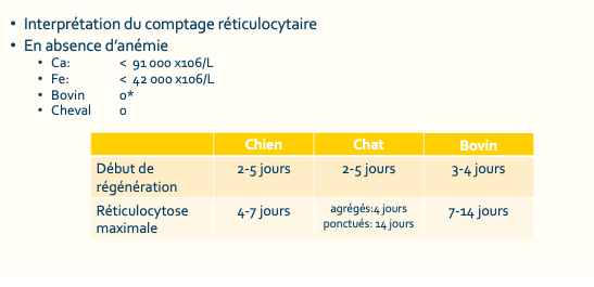chez le chien, on considère qu’un comptage réticulocytaire > 60 000 - 91 000 x 10^6/L indique un début de régénération.