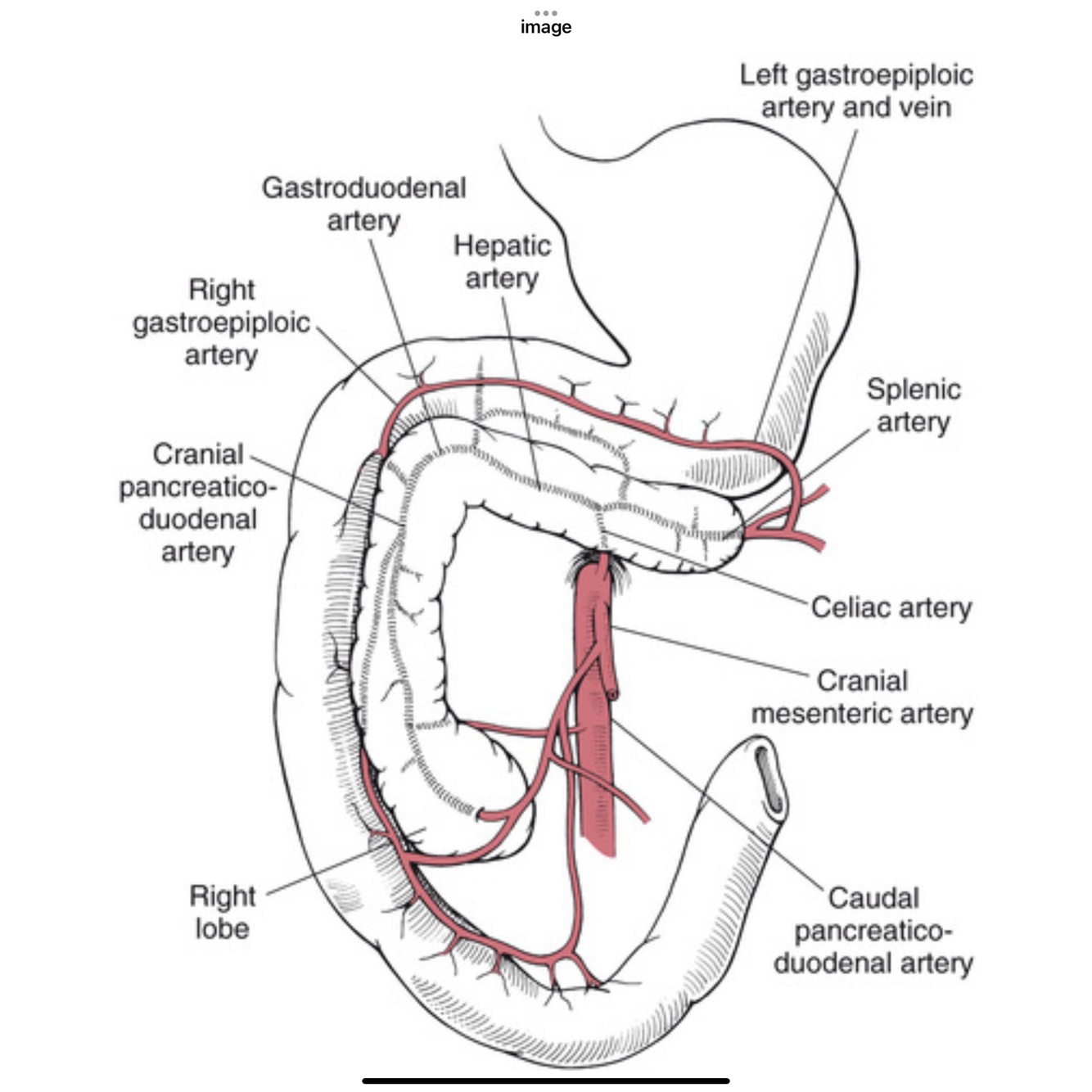 “The main blood supply to the left pancreatic lobe is provided via branches of the splenic artery; however, branches from the common hepatic and gastroduodenal arteries also supply portions of it. The main vessels of the right lobe of the pancreas are the pancreatic branches of the cranial and caudal pancreaticoduodenal arteries that anastomose in the gland. The cranial pancreaticoduodenal artery is a terminal branch of the hepatic artery; the caudal pancreaticoduodenal arises from the cranial mesenteric vessel. These vessels also provide branches that supply the duodenum. Because they are closely associated with the proximal portion of the right lobe of the pancreas, care must be taken not to damage these vessels during pancreatic surgery, or devitalization of the duodenum may occur.”