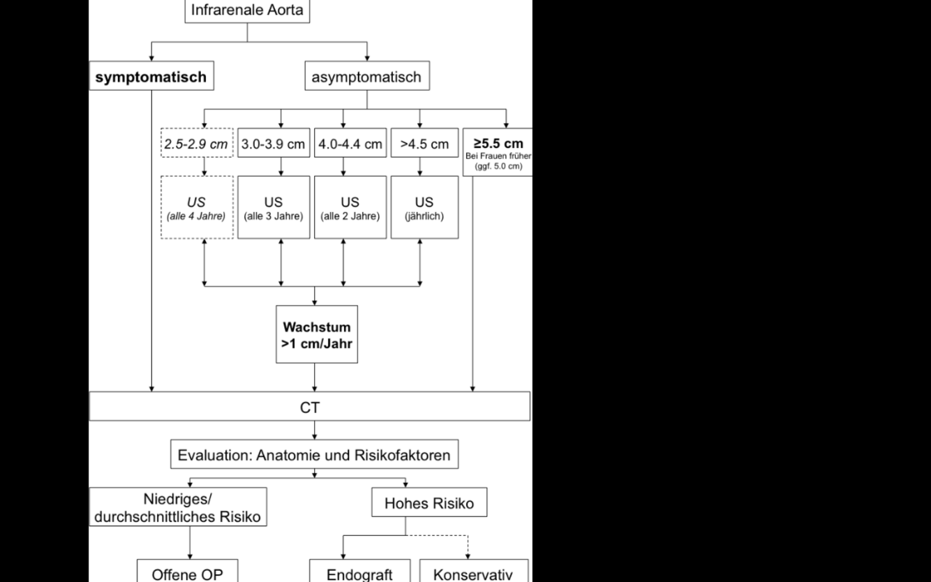 - Intervention verbessert nur Aneurysma assoziierten Mortalität aber nicht die gesmat Mortalität, da dieses Pat oft generell krank, midn Lebensdauere 2 Jahre