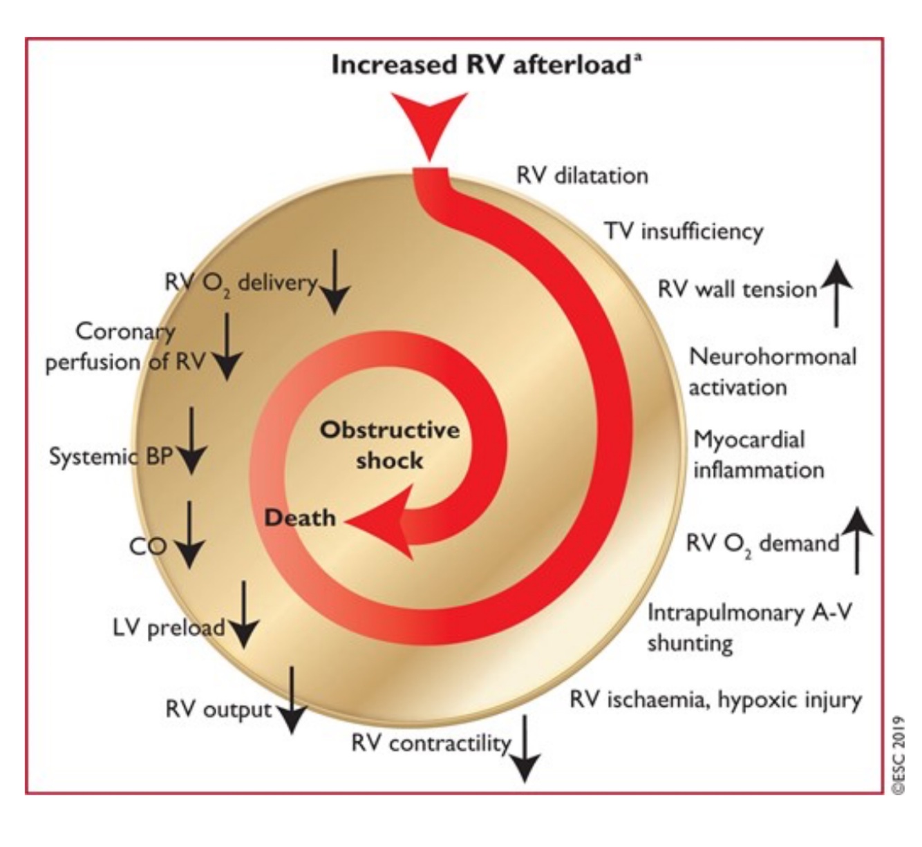 The abrupt increase in PVR results in RV dilation, which alters the contractile properties of the RV myocardium via the Frank–Starling mechanism. The increase in RV pressure and volume leads to an increase in wall tension and myocyte stretch. The contraction time of the RV is prolonged, while neurohumoral activation leads to inotropic and chronotropic stimulation. Together with systemic vasoconstriction, these compensatory mechanisms increase PAP, improving flow through the obstructed pulmonary vascular bed and thus temporarily stabilizing systemic blood pressure (BP). However, the extent of immediate adaptation is limited, as a non-preconditioned, thin-walled RV is unable to generate a mean PAP >40 mmHg.