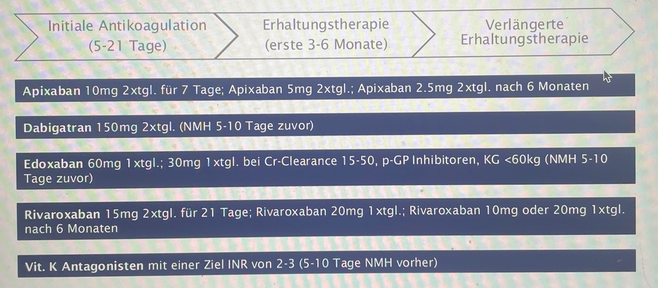 Nach 6 Monaten Antikoagulation kann eine reduzierte NOAC-Dosis (Apixaban 2,5 mg b.i.d. oder Rivaroxaban 10 mg o.d.) erwogen werden für Langzeittherapie