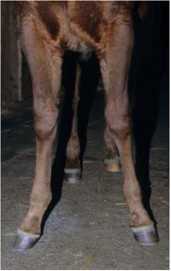 TRUE / FALSE: Based on the description, the foal in the image has a bilateral valgus deformity.