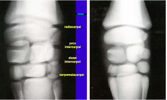 See normal radiograph on left. There should be some degree of increased joint space in young animals d/t the presence of more cartilage.