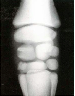 You take a radiograph of a foal and see this. What is happening in this carpus?