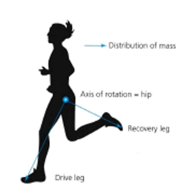 The recovery leg’s mass is distributed close to the axis of rotation at the hip, therefore, moment of inertia is low. Resistance to rotation is low and the leg moves back to the ground quickly