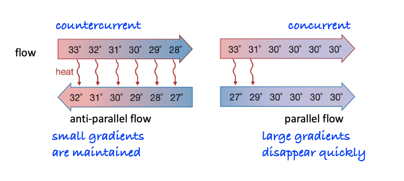 Camels have thick insulating layers of fur and fat, minimizing heat uptake by radiation or thermoconduction. To avoid overheating their blood and keeping especially the brain cool, the arteries leading to the brain are pre-cooled by a net of capillaries transporting cool blood in the opposite direction (countercurrent heat exchange). The blood flowing through the capillaries is cold because it has been cooled by passing the nasal cavity for a countercurrent heat exchange with the airways: dry, incoming air is moistened by the mucosa, and evaporation cools down the air and the tissues surrounding the airways. Upon exhaling, water is recaptured from the warm air, so that the water loss is minimized.