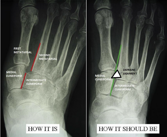 Injury to tarsometatarsal joint between the medial cuneiform and the base of the 2nd metatarsal; can be solely ligamentous injuries or involve the bony structures of the midfoot (in which case called a fracture dislocation)