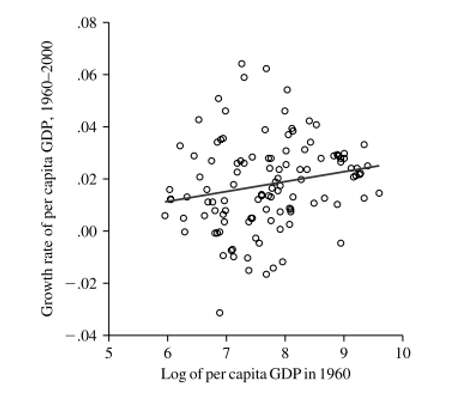 La figure ci-dessous (Log of per capita GDP in 1960, Growth rate per capita GDP, 1960-2000) montre qu’au niveau international,