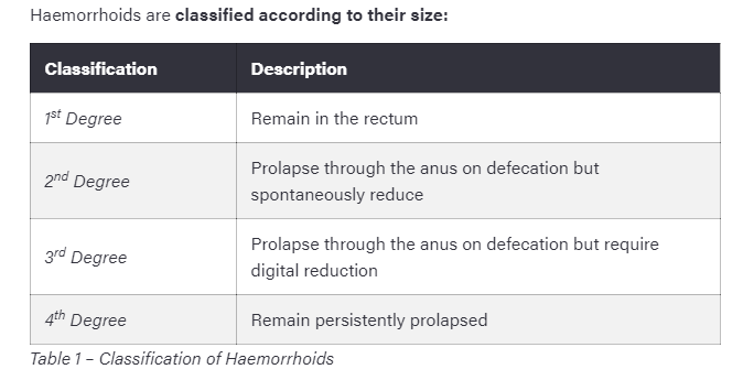 Discuss the classification of haemorrhoids (what are the 4 different degrees of haemorrhoids)