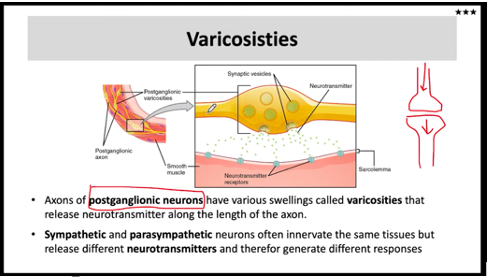 Various swellings in the axons of postganglionic neurons that release neurots (ACH) along length of axon. Ach can also be synthesized in terminal endings of CHOLINERGIC nerve fibers.