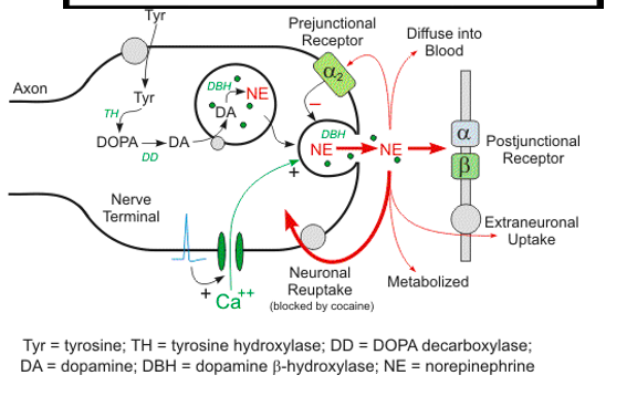 Begins in axoplasm of **adrenergic **nerve terminal and completed inside secretory vesicles. Comes from Tyr–>DOPA–>Dopamine–>NE.