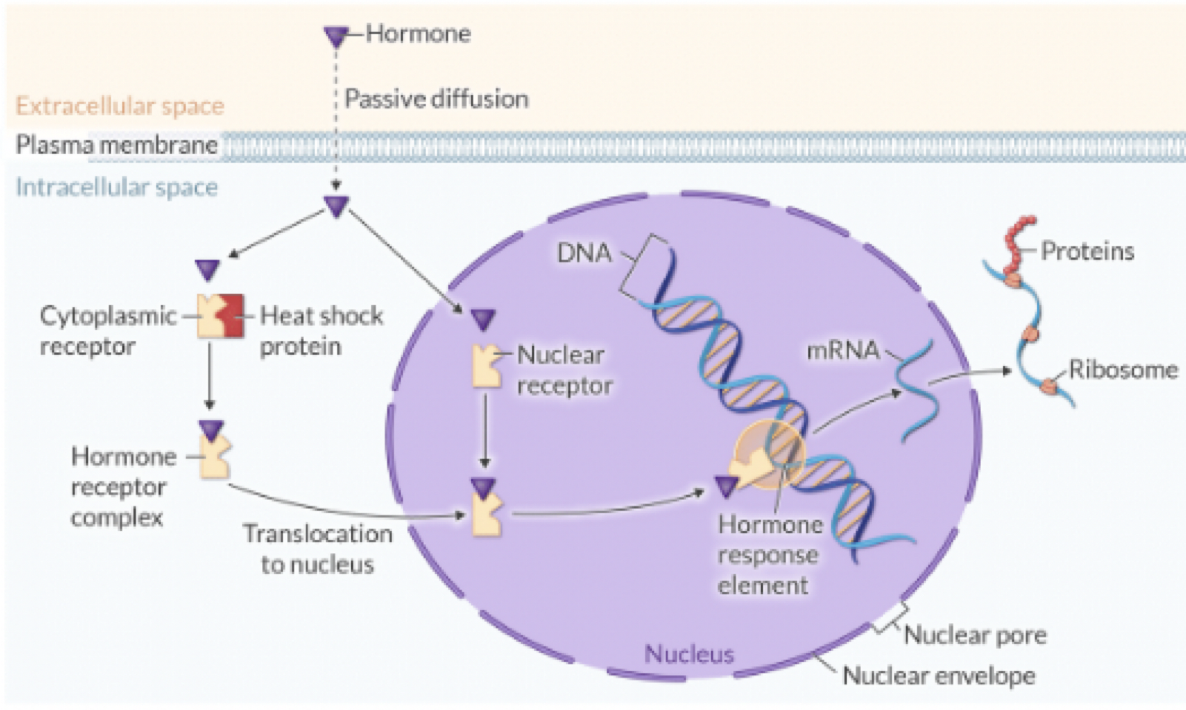 Ex: steroid binds to receptor in cystoplasm; thyroid hormone binds to receptor in nucleus