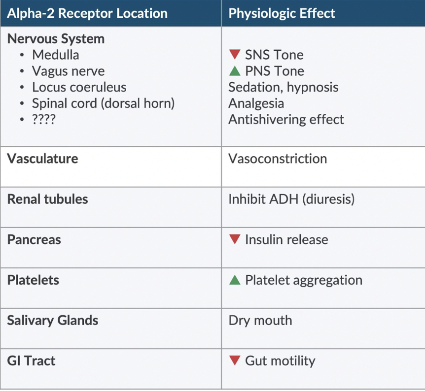 Also produces sedation, hypnosis, analgesia, depresses LOC, inhibits insulin release > hyperglycemia, promotes platelet aggregation