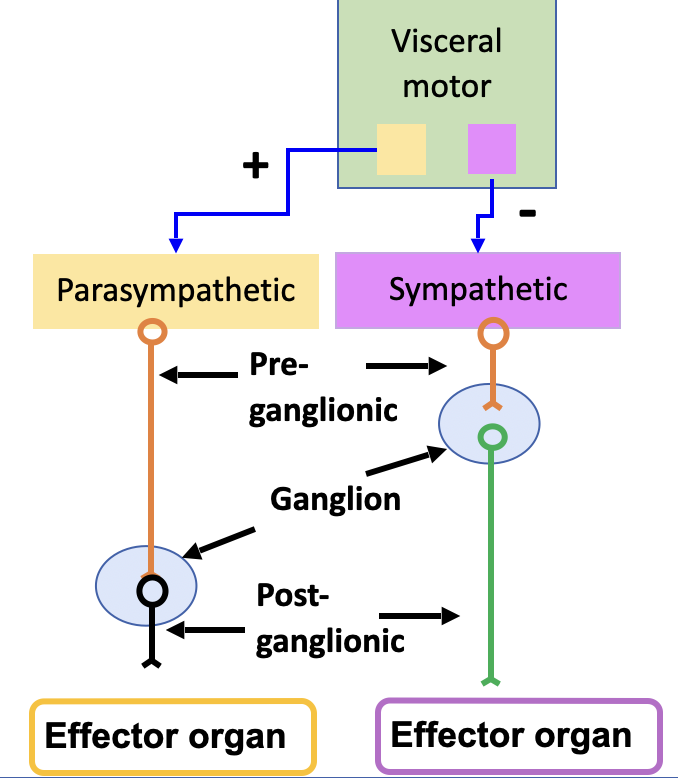 Outline the difference between the parasympathetic and sympathetic motor portions of the ANS and if there are any exceptions