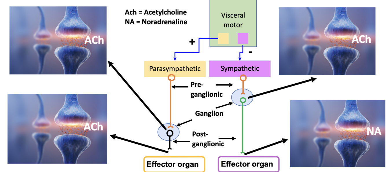 Both are mainly comprised of 2 neurons-A pre and post ganglionic neuron