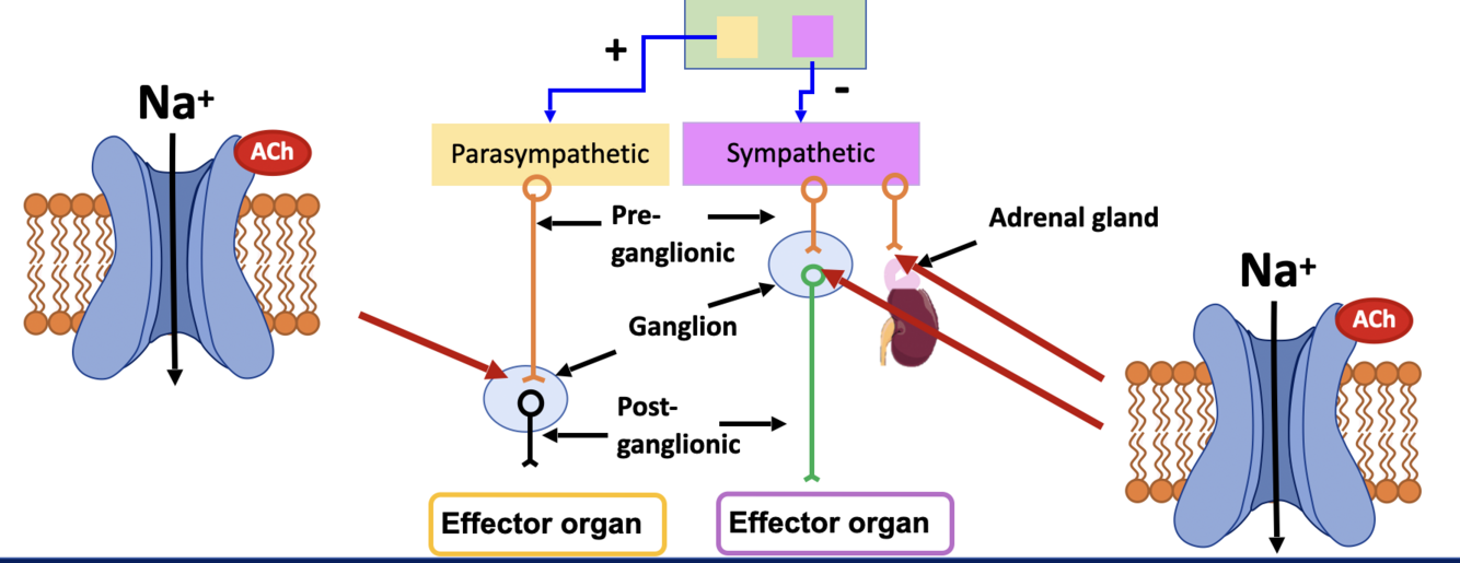 Where do you find the nicotinic acetylcholine receptors in the ANS?