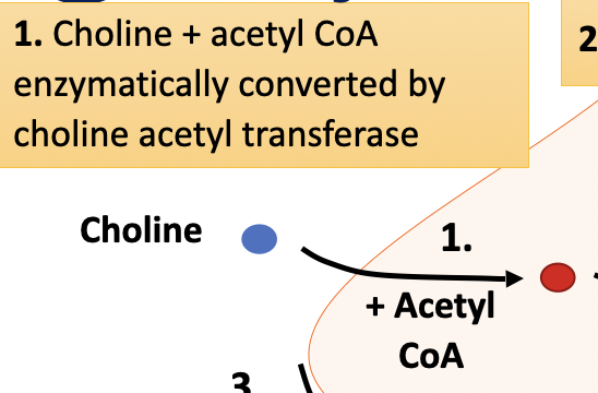 Choline enters the pre-synaptic terminal and combines with acetyl CoA and is converted into ACh by choline acetyl transferase