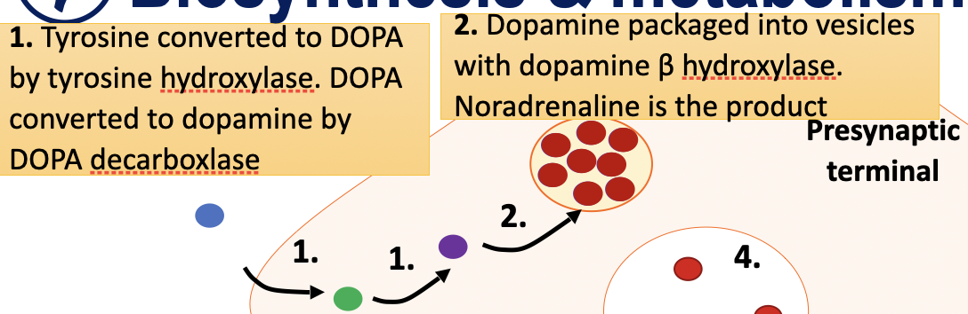 How is noradrenaline prepared from tyrosine for use in an adrenergic synapse