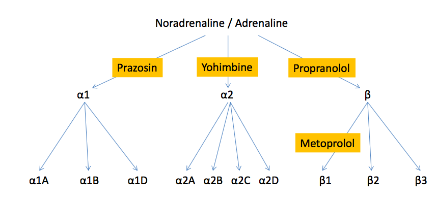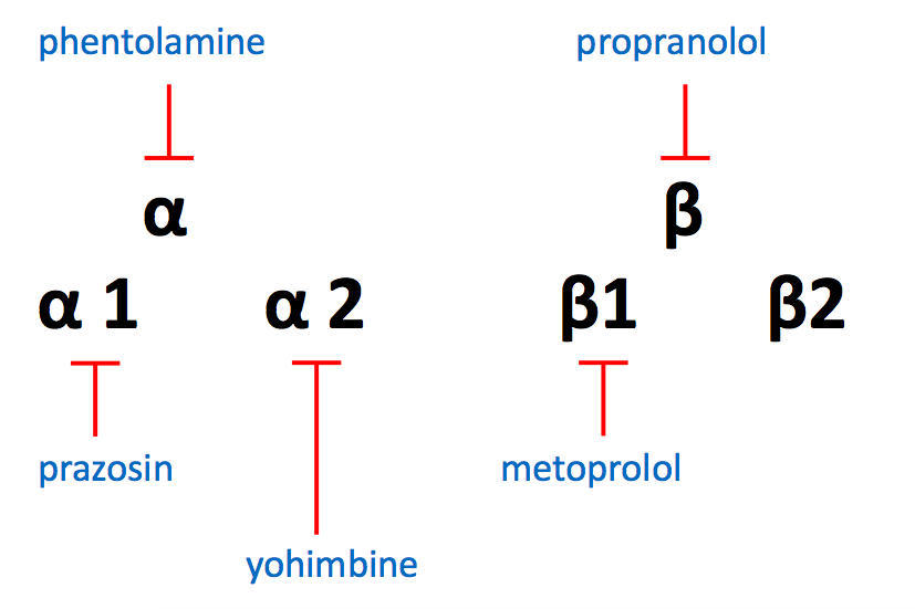Beskriv hvilke receptorer hhv. propranolol, phentolamin, prazozin, yohimbin og metoprolol blokerer