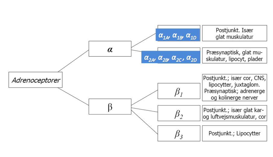 Der findes forskellige adrenoceptorer - beskriv hvilke og hvor de findes