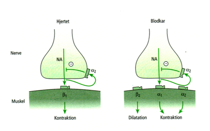 I hjertet findes beta1-receptorer I blodkar findes beta2-receptorer (dilation) og alfa1 og 2 (kontraktion)
