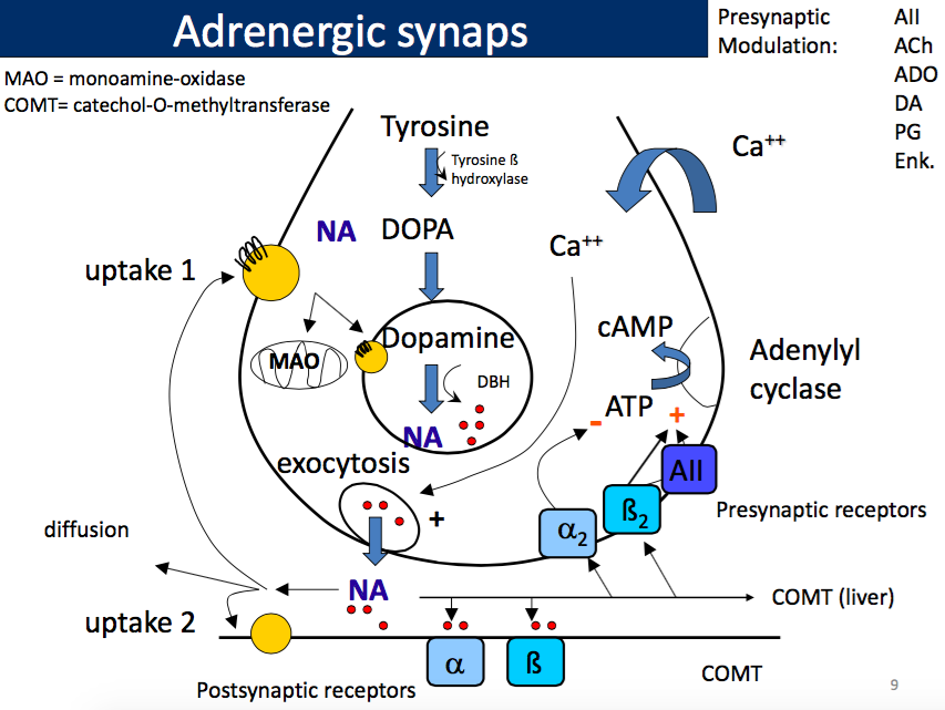 Kokain inhiberer uptake 1 Tyramin: sympatomimetisk amin, hvis virkning minder om NA (der er fx meget i blåskimmelost). Substrat for uptake 1 og MAO Yohimbine: alkoloid, der kompetitivt blokerer alfa2-receptorer (som jo er præsynaptiske). Resultat: den øger perifer sympatisk neurotransmission. Beta-blokkere (beta-adrenoceptor antagonist): findes beta1-selektive (hjertet) og non-selektive Betamimetics (beta-adrenoceptor agonist): glatmuskulatur-relaksation i lungerne, dilation og åbning af luftveje. (G-protein-koblede)