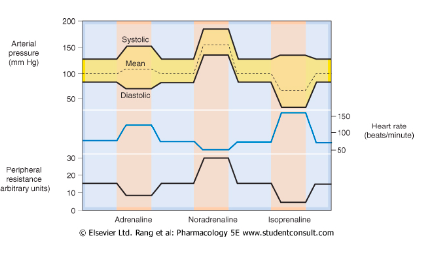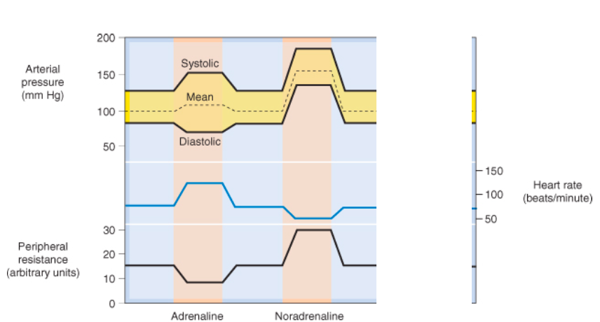 BP, HR og perifer resistens som funktion af tiden. Adrenalins effekt på disse faktorer er altså anderledes end NAs.