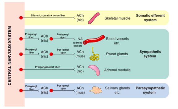 Præganglionære kolinerge sympatiske fibre aktiverer postsynaptiske nikotine receptorer Postganglionære kolinerge sympatiske nerver til svedkirtler samt glat muskulatur i hud og muskler aktiverer synaptiske muskarine receptorer Postganglionære adrenerge sympatiske nerver aktiverer postsynaptiske adrenoceptorer