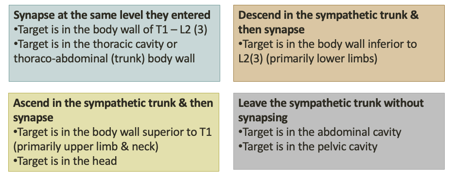 Routes that a preganglionic sympathetic fiber can take from the entry point into the sympathetic trunk: