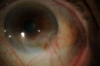 PUK: Crescenteric peripheral ulcer with stromal thinning/oedema and DM folds with scleritis