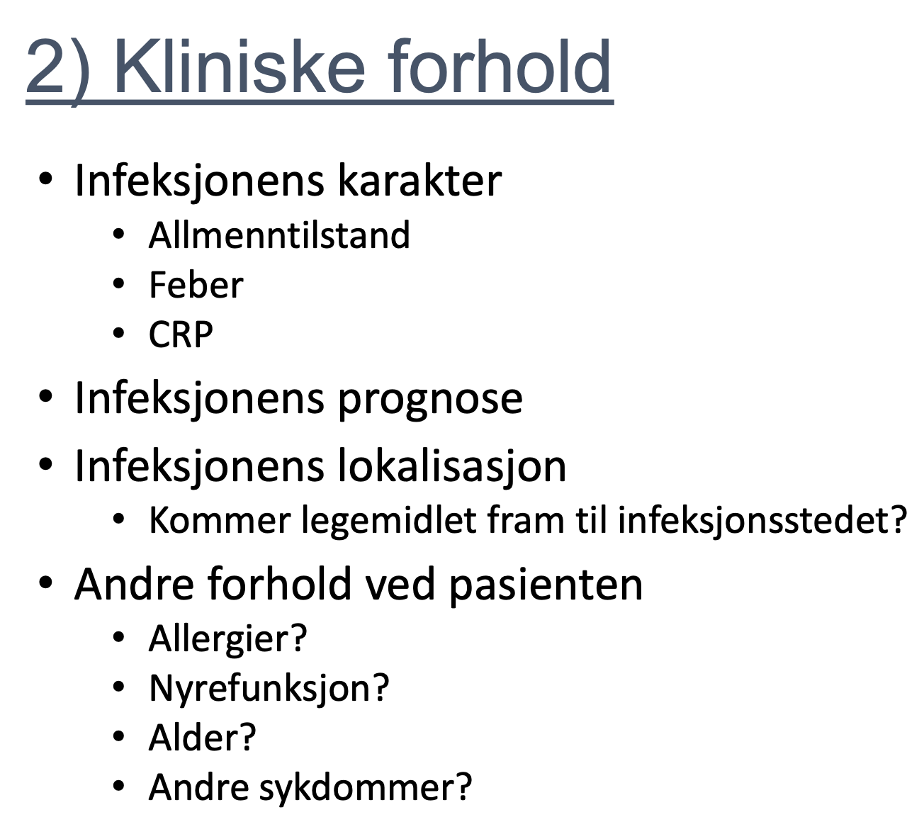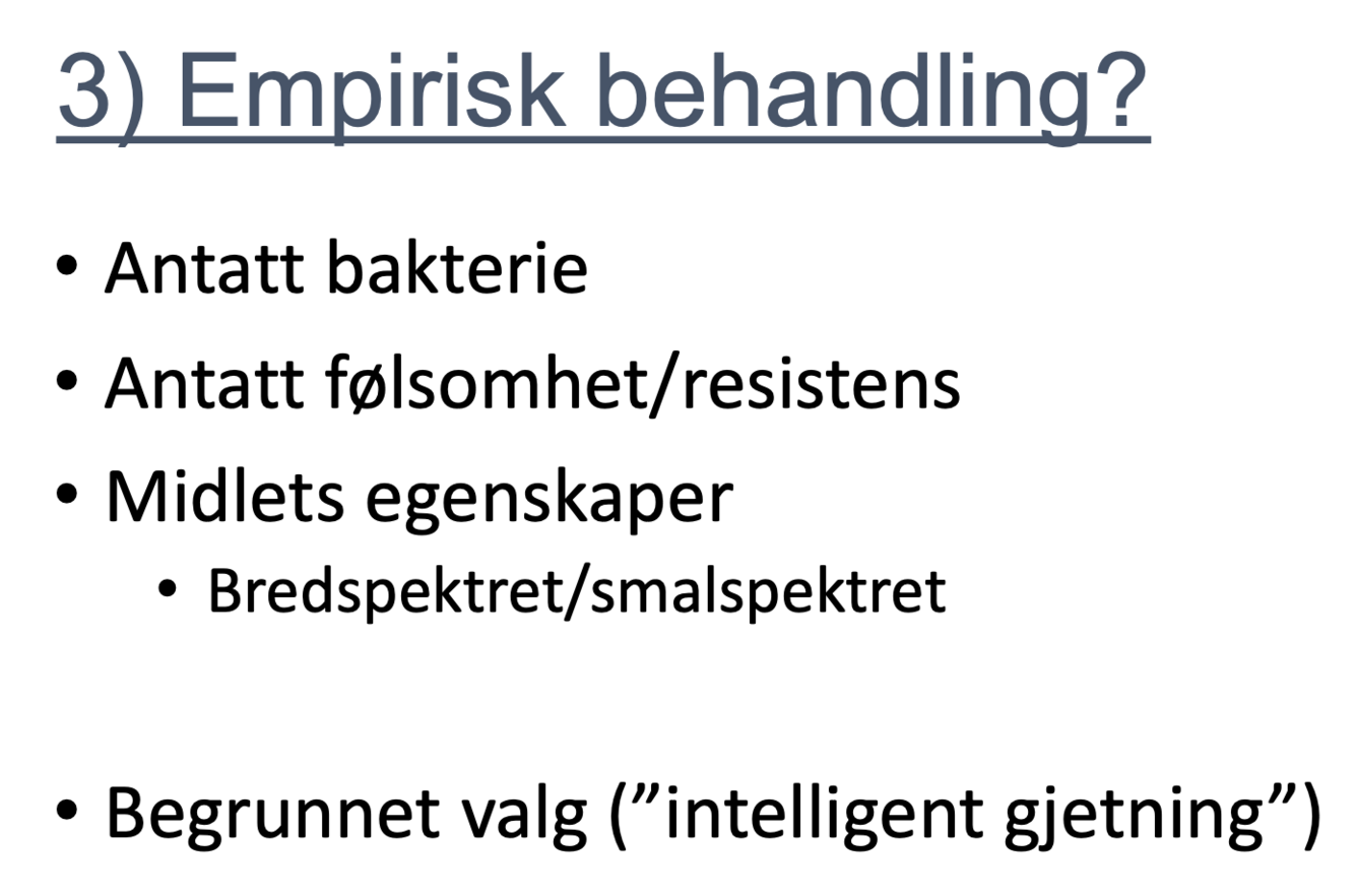 Hvilke kliniske forhold bestemmer hva slags ab. som skal skrives ut til pas.?