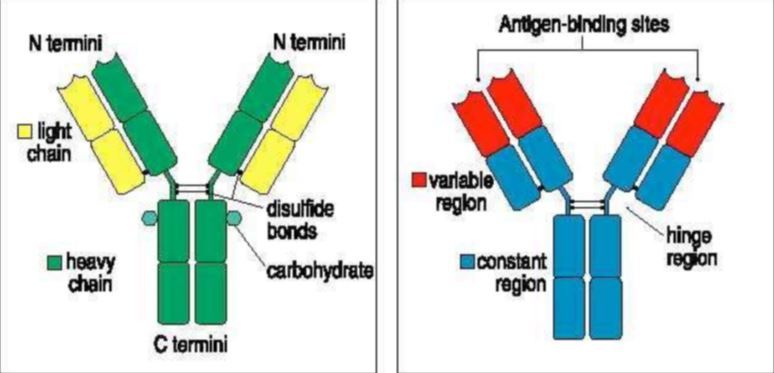 Variable region at the top of the “Y” where the antibody recognises pathogens, consisting of two heavy chains and two light. And the constant region below variable regions and base. This part recruits other components.
