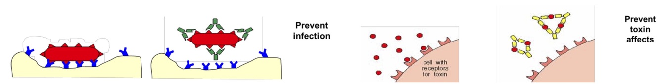 Ab binds to pathogen or toxin and sterically hinders their binding to cell surface receptors.