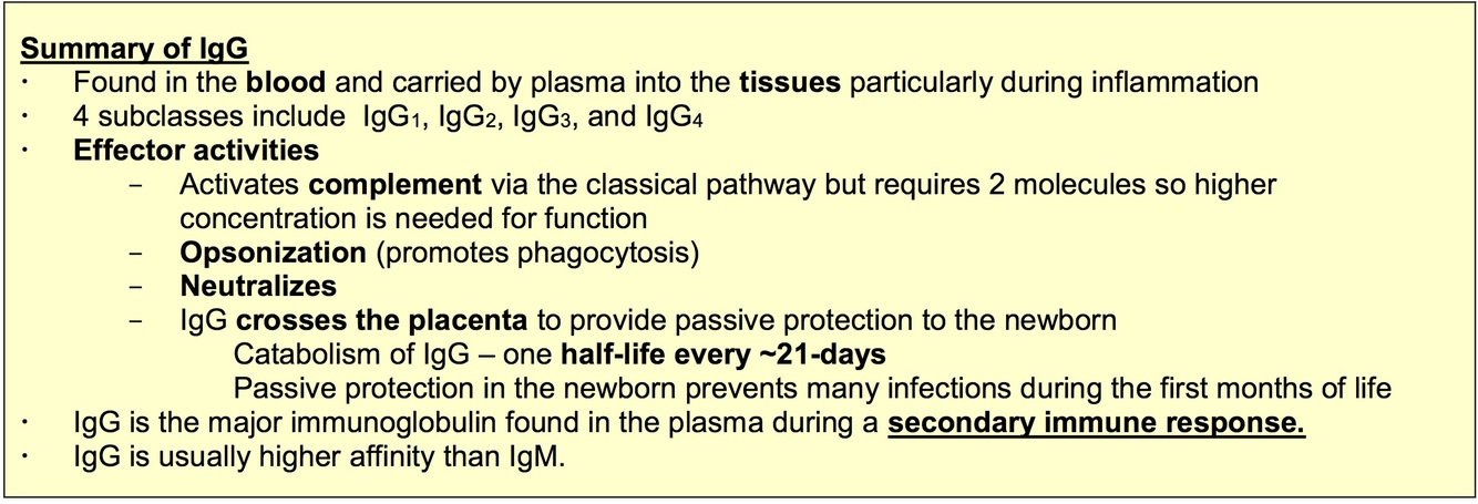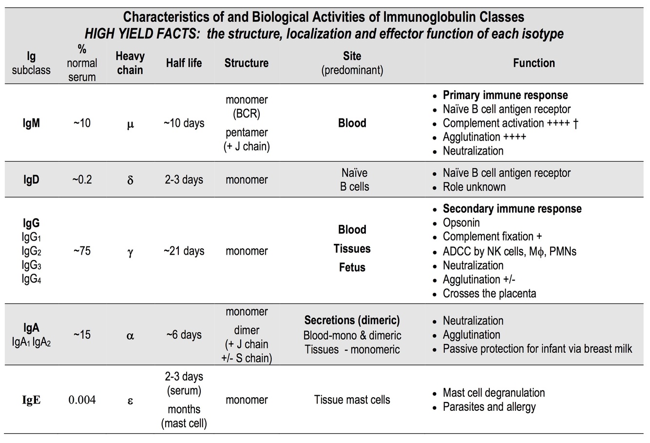 Immunoglobulin Classes Summary Table