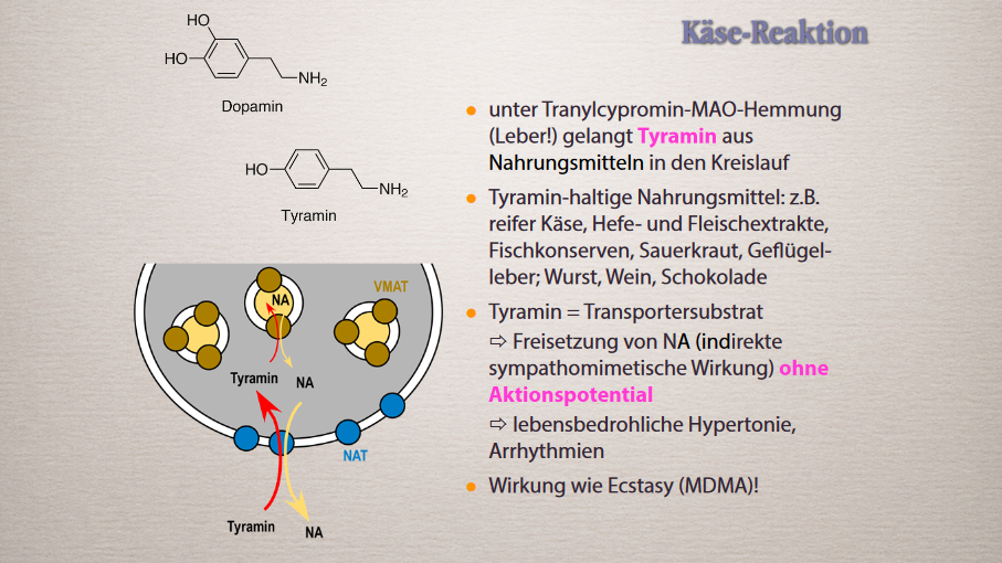 -> Tranylcypromin hemmt Abbau von Tyramin -> dadurch RR-Anstieg bis zur hypertensiven Krise möglich - deshalb muss Tyramin-Arme Diät eingehalten werden