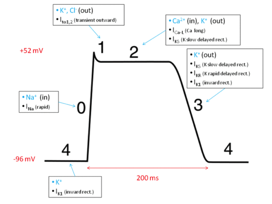 Ca enters the cell, moving slowly K exits the cell these two balance out the membrane potential and cause the “plateau”