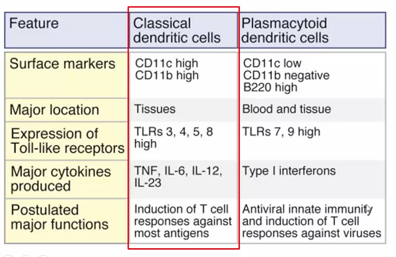 There are classical dendritic cells that we mostly talked about, they’re the ones that make TNF and IL6 and then there are plasmacytoid dendritic cells that are important in viral infections since they make IL type 1