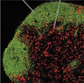 Outside (green) is the B cell zone and then inside (red) is the region called T cell zone. The red stains are actually dendritic cells, they go to the T cell zone and interact with T cells in order to presnt the antigen.
