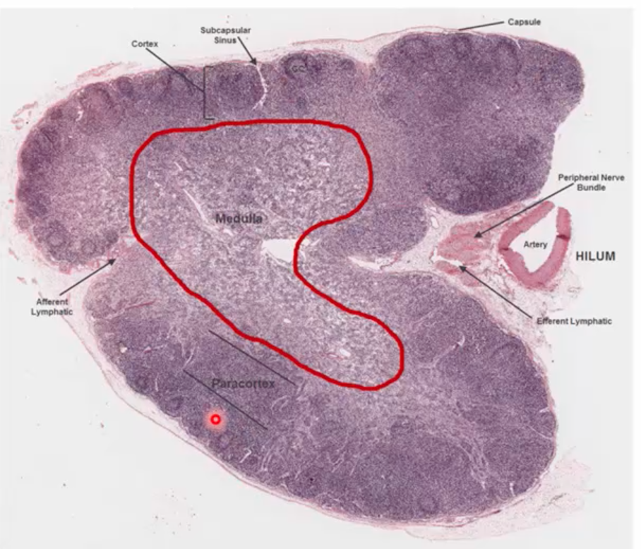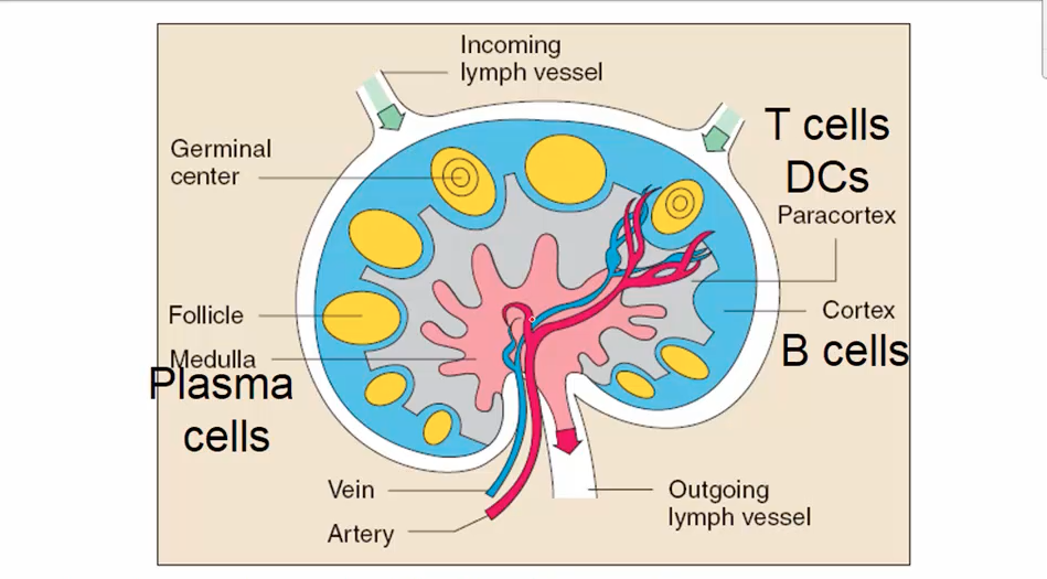 The B cell zone is called the cortex and the T cell zone is called the Paracortex. Medulla is where the B cells go when they are pumping out the antibodies. Follicles is where the B cells are assembled. Also the entire lymph node is covered in a capsule.