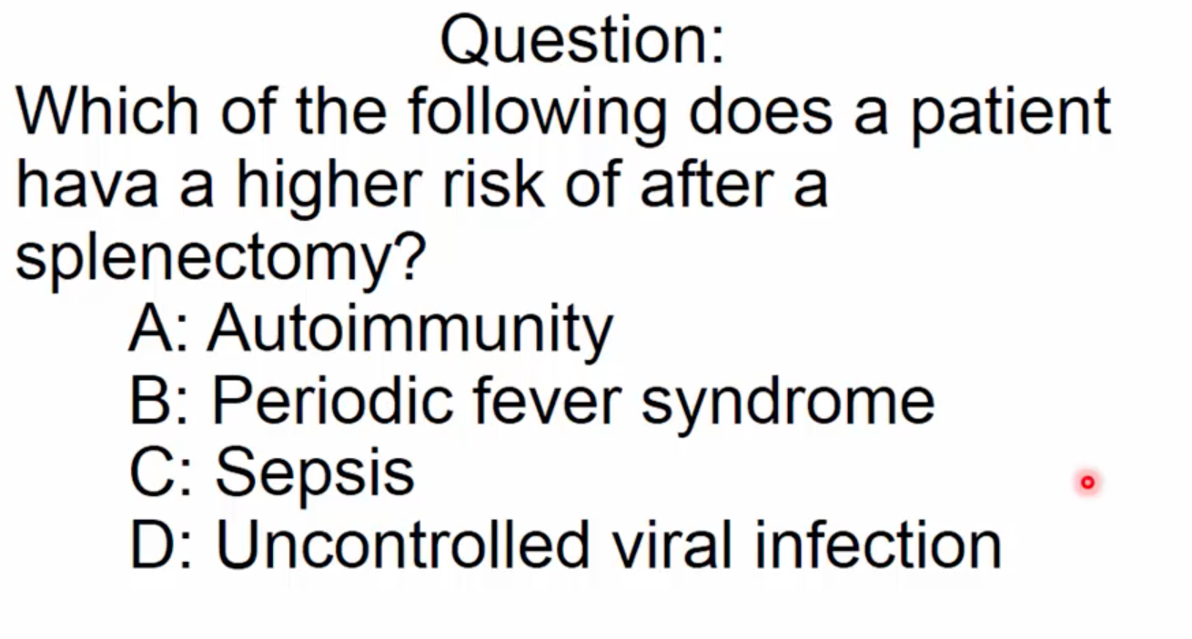 The answer to this is C and she stated that sepsis usually is caused by bacterial infection with the bacteria invading in the blood. This will go unchecked if there is no spleen whereas if there is an uncontrolled viral infection, dendritic cells in that tissue will still be able to phagocytose, mature and move to the lymph nodes to present the antigen to the T cells