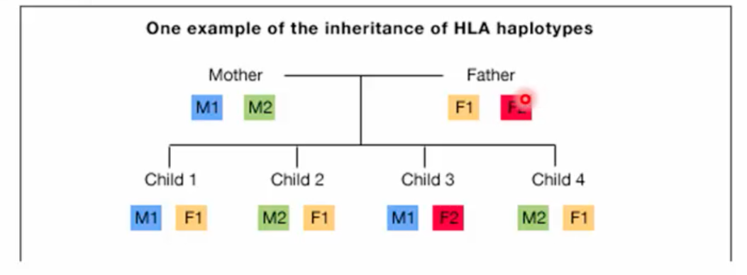 Due to codominance all of the B, C and A subunits from both of the parents are expressed. Since there are many polymorphisms found for this gene then it three subunits of HLA genes would be different which would allow six different MHC proteins to be expressed, allowing 6 different peptides to be presented altogether.