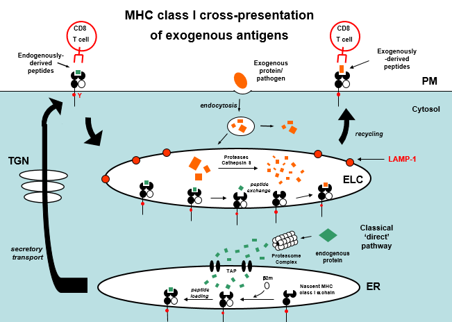 Not fully understood mechanism but in DCs, MHC class I molecules traffic from the cell surface into LAMP-1+ endosomal peptide-loading compartments (ELCs) by way of a